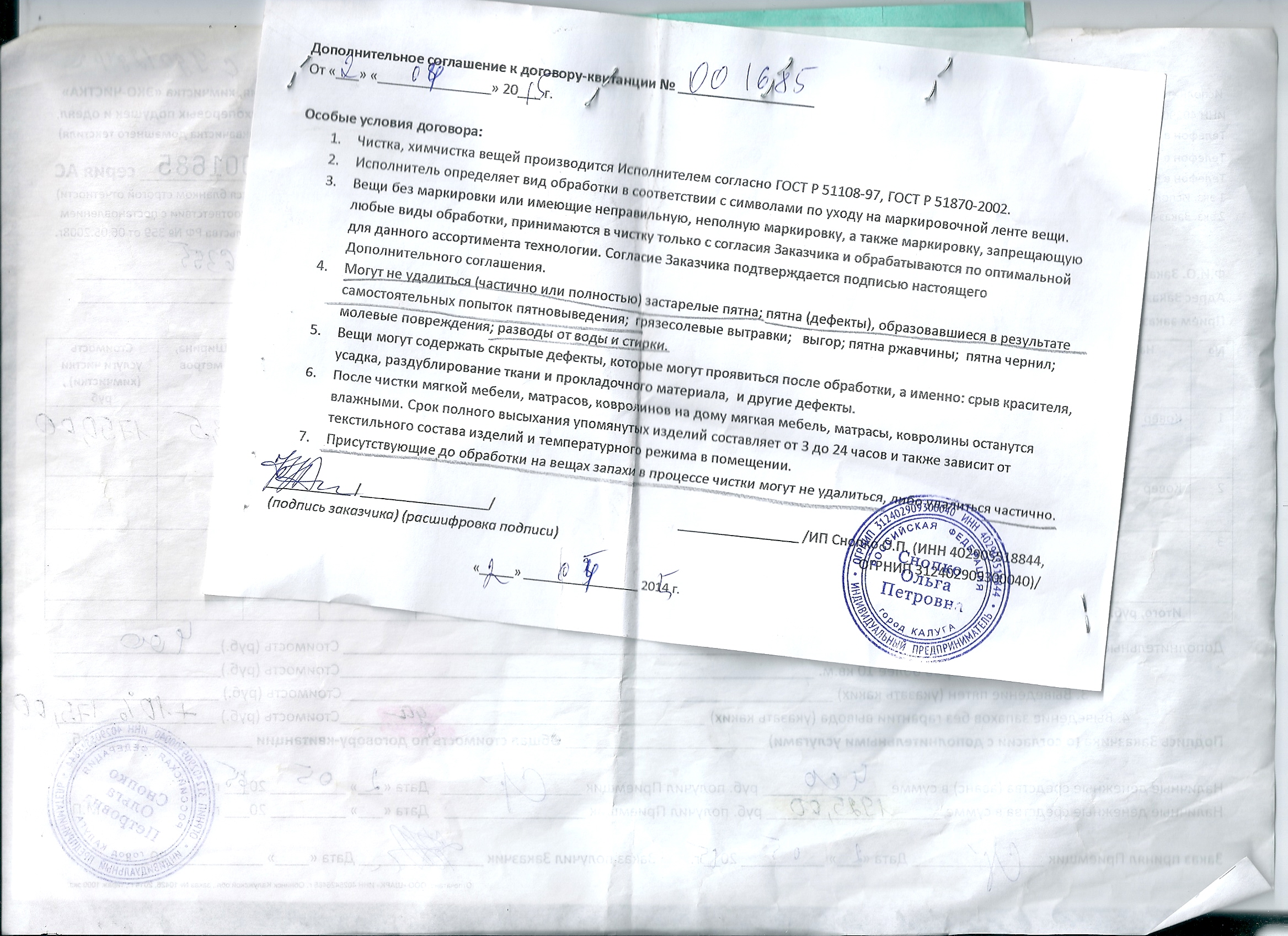 2. Запахи и все пятна без гарантии полного и частичного вывода (может удалиться, а может и нет), мы об этом сразу предупреждали и ее в том числе. Она подписывалась под этими обстоятельствами ДО ЧИСТКИ, в течение двух дней выложим на этом сайте документ с ее подписью. Сейчас она может писать все что хочет, что чего-то не знала, но тем не менее, ее предупреждали заранее.